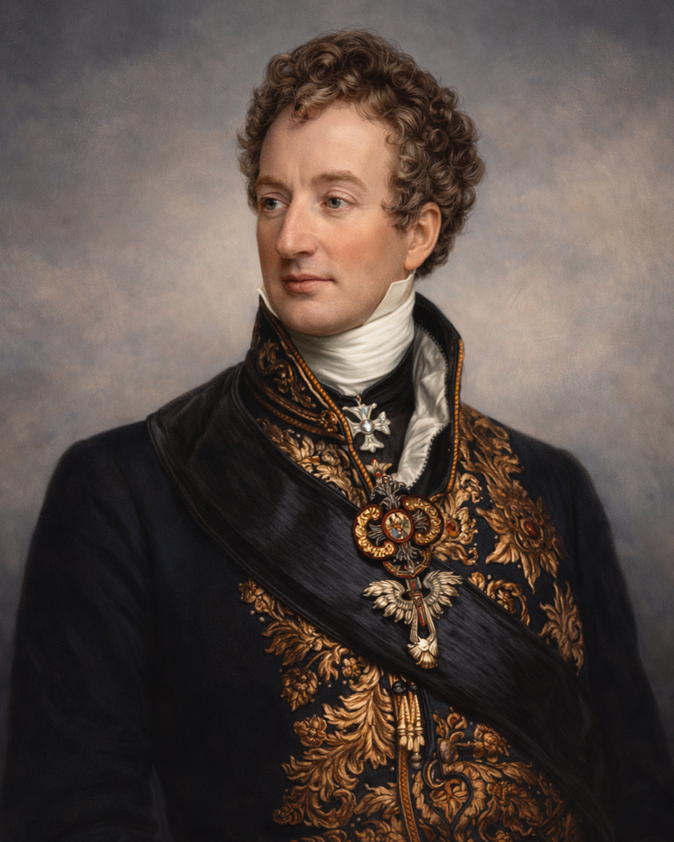 Klemens Wenzel Nepomuk Lothar, Prince von Metternich-Winneburg zu Beilstein (1773–1859), was an Austrian statesman and diplomat who dominated European politics after the Napoleonic Wars. Serving as Austria’s foreign minister (1809–1848) and chancellor (1821–1848), he became the chief architect of the post-Napoleonic order and a symbol of 19th-century conservatism.